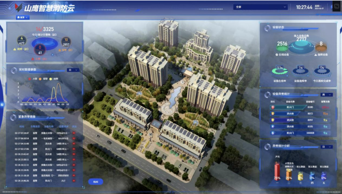 “手机发来报警,某处有着火点!”智慧消防云平台中显示火灾现场的视频画面,第一时间传输到物业人员的手中,清楚地看到着火点的位置及情况后,物业人员根据着火点位置,紧张、有序地通过语音报警系统组织楼层群众撤离,并第一时间进行火灾报警:“您好,火灾报警,**市**区**路**号…