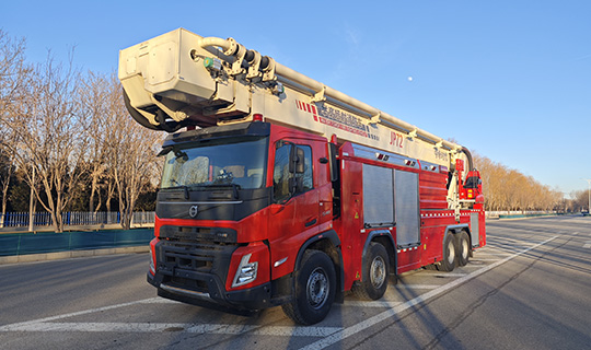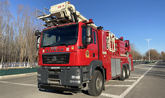 举高喷射消防车装备有水泵、泡沫一水两用炮和泡沫液罐,灭火能力强,作业范围大,操作方便,作业安全保护装置齐全,行驶机动灵活。